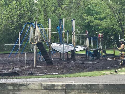 Officials said, upon arrival, crews found the playground equipment and rubber mulch heavily involved in fire.