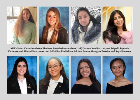 This month, AHA presented the Sister Catherine Green Kindness Award to seniors Kaya Simmons of West Orange and Georgina Paredes of Bergenfield, juniors Alina Keshishian of Englewood Cliffs and Adriana Santos of Ridgefield, sophomores Raphaela Cardenas of Clifton and Shivani Sahu of Paramus, and freshmen Ava Tripodi of Emerson and Graicen Van Blarcom of Glen Rock.