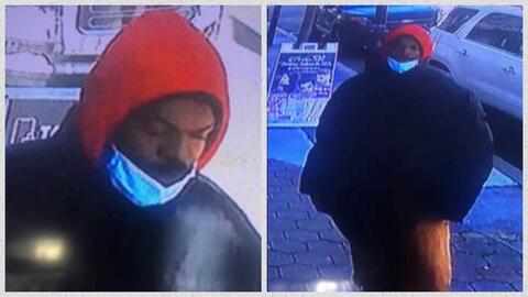 The suspect was wearing a black jacket, red hooded sweater, beige pants and red sneakers.