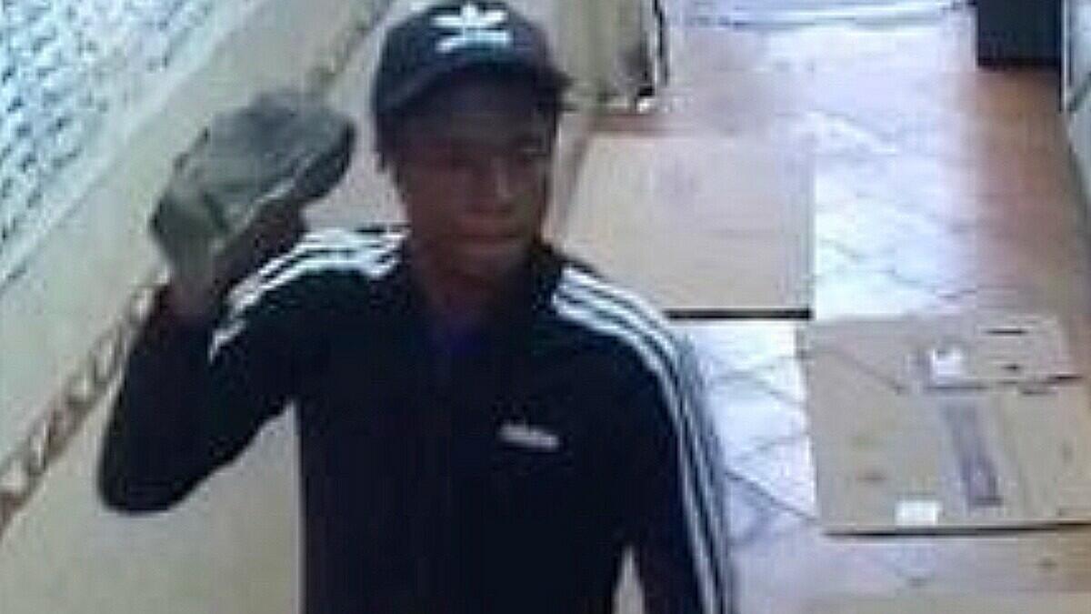 He is described as wearing a black Adidas track jacket with stripes on the sleeves, a black Adidas cap, black and white sweatpants and black Nike sneakers.