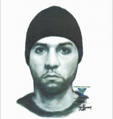 The Prosecutor’s Office today is distributing to the media a New Jersey State Police artist sketch of the suspect, described as an unknown Hispanic male, possibly in his 30s, with short-trimmed facial hair and wearing a black winter hat. Investigators are also releasing a brief surveillance video clip depicting the suspect’s vehicle traveling through Elizabeth.