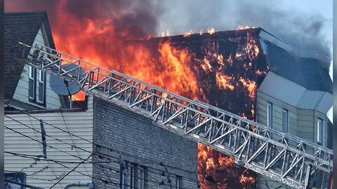 Upon arrival, fire crews were met with heavy flames tearing through the roof of the three-story wood-framed house, with the fire threatening to spread to adjacent buildings.