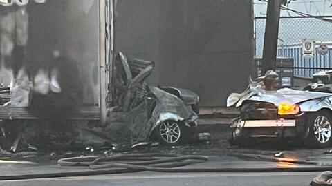 The car that rear-ended the truck was ignited in flames with a downed power line and trapped occupants inside the car.