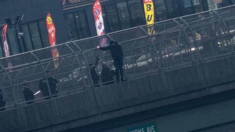 The incident began at approximately 4:15 p.m. when an unidentified man climbed over the bridge fence and is now hanging from the gate, visibly distressed.