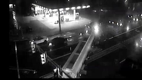 The impact left the truck precariously perched on the concrete barrier, leaking fluids into the roadway.