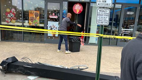 The pole subsequently slammed into the Cold Stone Creamery glass next to the entrance door, smashing the entire window pane of the business.