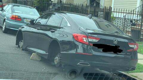 According to officials, residents on Grove Street near Nye Avenue contacted police when they woke up to find a car stripped of its wheels and supported by cinder blocks.