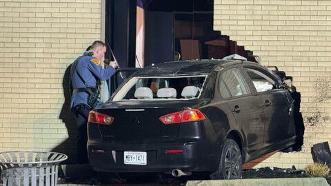 When police and firefighters arrived, they discovered a car that had smashed through the brick exterior of a commercial structure, with nearly half of the vehicle lodged inside the building.
