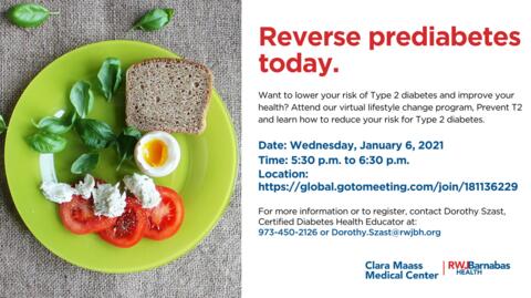 For those who want to lower their risk of Type 2 diabetes and improve their overall health, Clara Maass Medical Center, a facility of RWJBarnabas Health is offering a free, online program to educate members of the community on how they may reduce their risk for developing Type 2 diabetes.