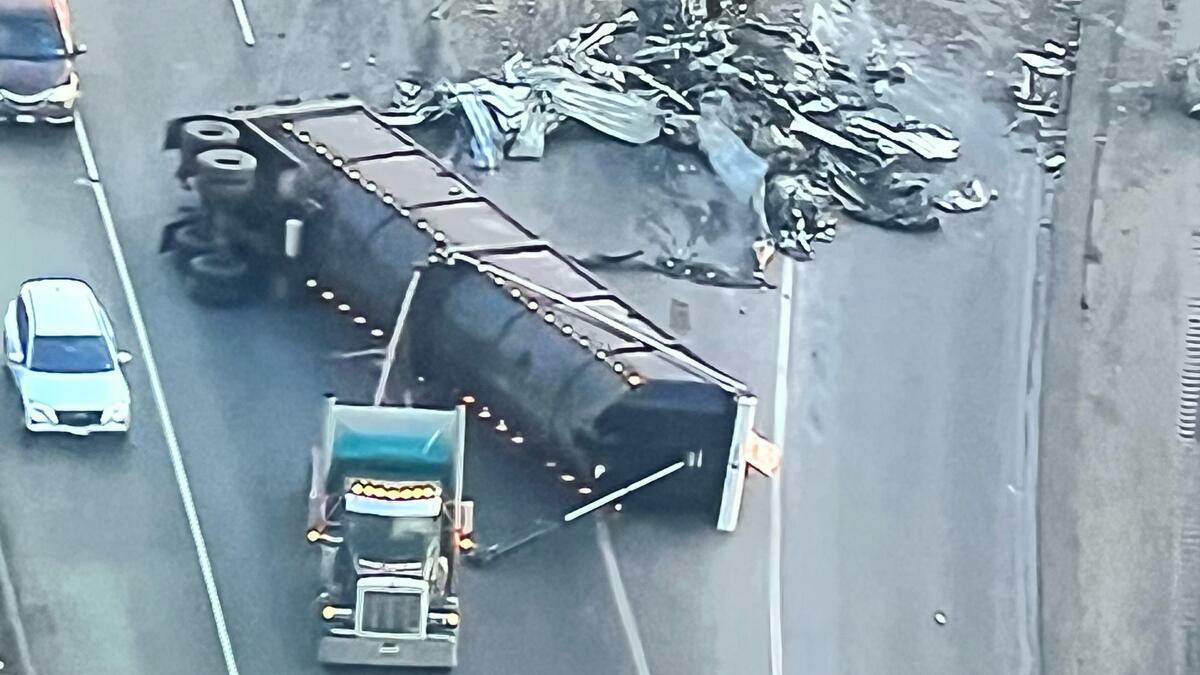 Authorities confirmed the tractor itself did not roll over, but the trailer came down, scattering recyclable metal across the roadway.