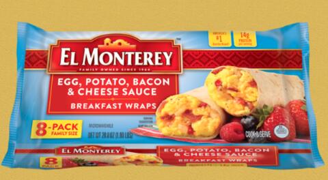 8-Pack family size film packages containing “**EL MONTEREY EGG, POTATO, BACON & CHEESE SAUCE BREAKFAST WRAPS**” with “Best if Used By” dates of 01/17/2020 and 01/18/2020 and lot codes 19017 and 19018.