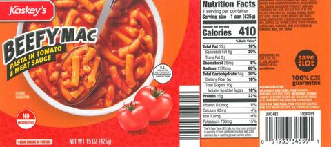 15-oz. canned items of “Kaskey’s BEEFY MAC PASTA IN TOMATO & MEAT SAUCE” with Best By JUL 07 2021.