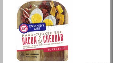 3.1-oz. plastic packages containing “EGGLANDS BEST HARD-COOKED EGG BACON & CHEDDAR” with “USE BY” dates of 12/23/19, 1/3/20, 1/17/20, 1/31/20, 2/6/20, and 2/24/20.