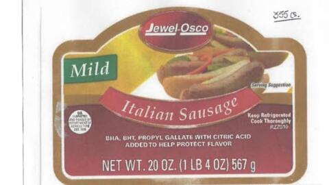 20-oz. plastic wrapped tray packages containing sausage links of “Jewel-Osco Mild Italian Sausage” with a sell-by date of 4/17/20.