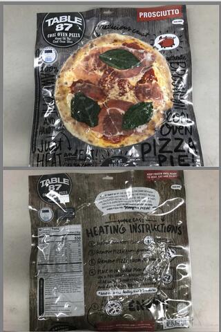 9.6-oz. plastic shrink-wrapped packages containing a single personal size pizza identified as “TABLE 87 COAL OVEN PIZZA Home Of The Coal Oven Slice PROSCIUTTO” with UPC code 804879558286 and 10804879558283.