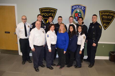 Today was a happy occasion for public safety personnel in Cranford when cardiac arrest survivor Catherine Hallax met with the responders who performed cardiopulmonary resuscitation (CPR) when she suffered a heart attack on January 22, 2015.