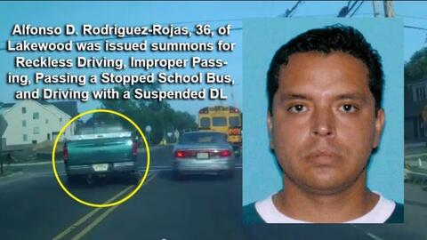 By 4:30 p.m. today, Alfonso D. Rodriguez-Rojas, 36, of Lakewood was issued summons for reckless driving, improper passing, passing a stopped school bus, and driving with a suspended DL.