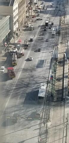 This image is a high overhead look at emergency responder activity in the 500 block of Broad Street in Newark's Downtown where at least one person is suffering burns inside a building at this time.