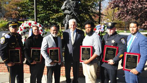 During the ceremony, the County Executive presented Essex County Community Star Awards to eight Essex County employees who have served or continue to serve in the US Armed Forces, including Andres Lebron (Army National Guard) from the Prosecutor's Office, Andres Made (Marines) and Tyronne Winn (Marines) from the Division of Family Assistance and Benefits, Christopher Richardson (Army) and Robert Sutton (Navy) from the Sheriff's Office, Johnny Lawton (Army) from the Surrogate's Office, and Larry Sermons (Army) and Sylvia Velez (Marines) from the Division of Employment and Training.