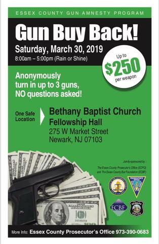 Anyone can anonymously turn in up to three guns, no questions asked. The gun buyback will be held at Bethany Baptist Church, Fellowship Hall, located at 275 West Market Street in Newark. Police officers from the Newark Police Department and detectives from the Essex County Prosecutor’s Office will be at the church to collect and secure the guns and to assist with the valuation of the weapons.