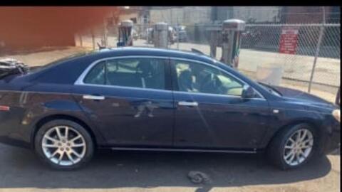 The car is a navy blue 2008 Chevy Malibu with tinted windows.