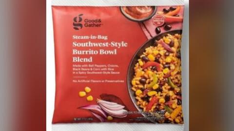 A recall has been issued for Good & Gather™ Southwest-Style Burrito Bowl Blend (12 oz frozen bags) after shrimp was found in the product without being listed on the label.