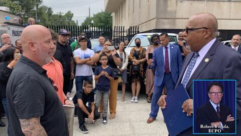 At a makeshift gathering in the parking lot, Acting Essex County Prosecutor Theodore N. Stephens II awarded Eddie a plaque in honor of his 24 years of outstanding service to law enforcement.