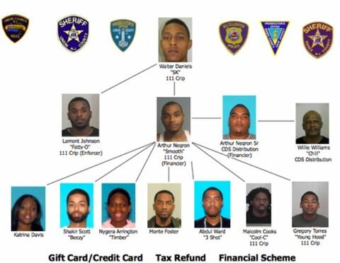 The investigation initially revealed that members and associates of Elizabeth’s 111 Neighborhood Crips street gang had become engaged in a pattern of white-collar crime, specifically through participation in two separate scams.