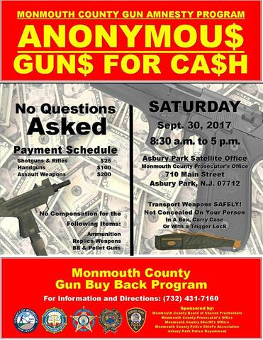 Monmouth County authorities are holding a Guns-For-Cash program today until5p at their satellite office located at 710 Main Street in Asbury Park.