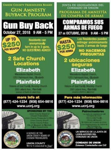 The gun buyback event is supported by the Union County Board of Chosen Freeholders and sponsored by the Union County Prosecutor and the Union County Sheriff with the Union County Division of Police and the police departments of the cities of Elizabeth and Plainfield.