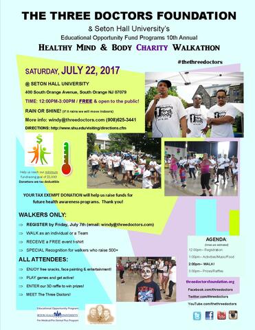 The Three Doctors and The Seton Hall Equal Opportunity Fund Department is requesting all residents and community members to come out and support The Three Doctor's "Healthy Mind, & Body" Charity Walkathon this Saturday, July 22, 2017.