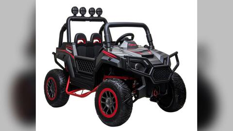 The toy UTVs measure 53 inches long, 43 inches wide and 27 inches tall when assembled. They are black with red trim, and “Torex” labels are on the front and side of the ride-on toy.