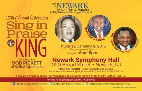 The City of Newark and The Newark Municipal Council proudly presents the 27th annual celebration Sing in Praise of King hosted by Bob Pickett of WBLS 107.5’s Open Line with keynote speaker Reverend Jesse Jackson Sr.
