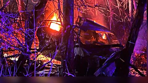 Police arrived and found a fully involved car in the wood area.