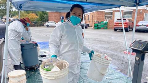Mu, Heyniger and student volunteers geared up with protective suits, gloves, masks and goggles, and sorted through Kean’s trash dumpsters on October 23 to learn exactly what is being tossed out that can be composted or recycled.