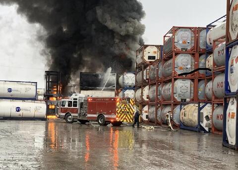 Authorities say the 2-alarm fire started on a Fork Lift and spread toward some chemical transport tanks stacked nearby.