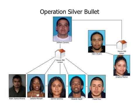 Arrested as the result of this operation were William Camino, 35, of Elizabeth; Yakin Bryant, 34, of Elizabeth; Ricardo Gayle, 25, of Plainfield; Jasmin Sanchez, 23, of Jersey City; Arain Juarez-Alvarez, 25, of the Bronx, N.Y.; Frank Pino, 29, of Elizabeth; Lakisha Mensah, 24, of East Windsor; and Eraiadna Victoria Mentor, 23, of Linden.