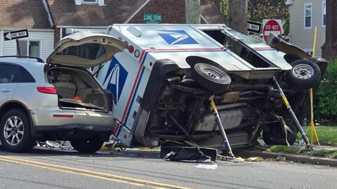 Upon arrival, first responders found the mail truck on its side on a pole after another vehicle crashed into it.