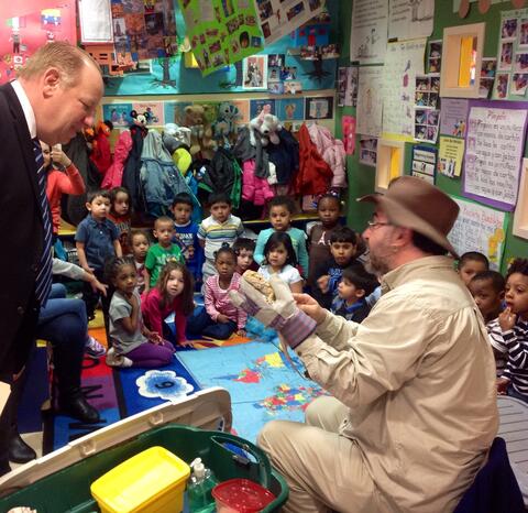 Pictured is Mayor Bollwage with Enzo, the Lizard Guy, and the children of Egenolf Early Childhood Center in Elizabeth, NJ.