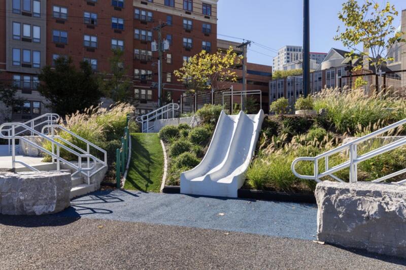Liberty Square Park’s unique tiered design embraces the site’s natural slope, creating inviting spaces for walking, reading, meeting with friends, or simply relaxing, MCPO officials say.