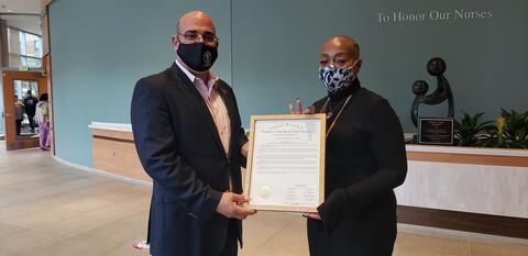 An official proclamation was presented to Young on October 13 by the Honorable Robert 'Bobby" Mercado, Essex County Freeholder in the Main Lobby of the Medical Center, along with members of her family and other distinguished guests from Clara Maass Medical Center