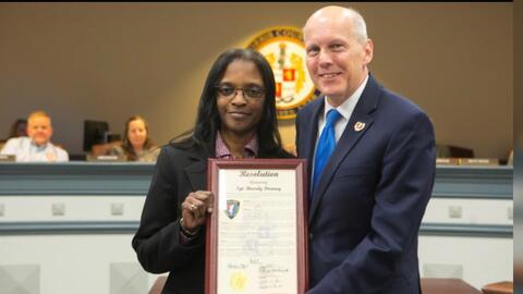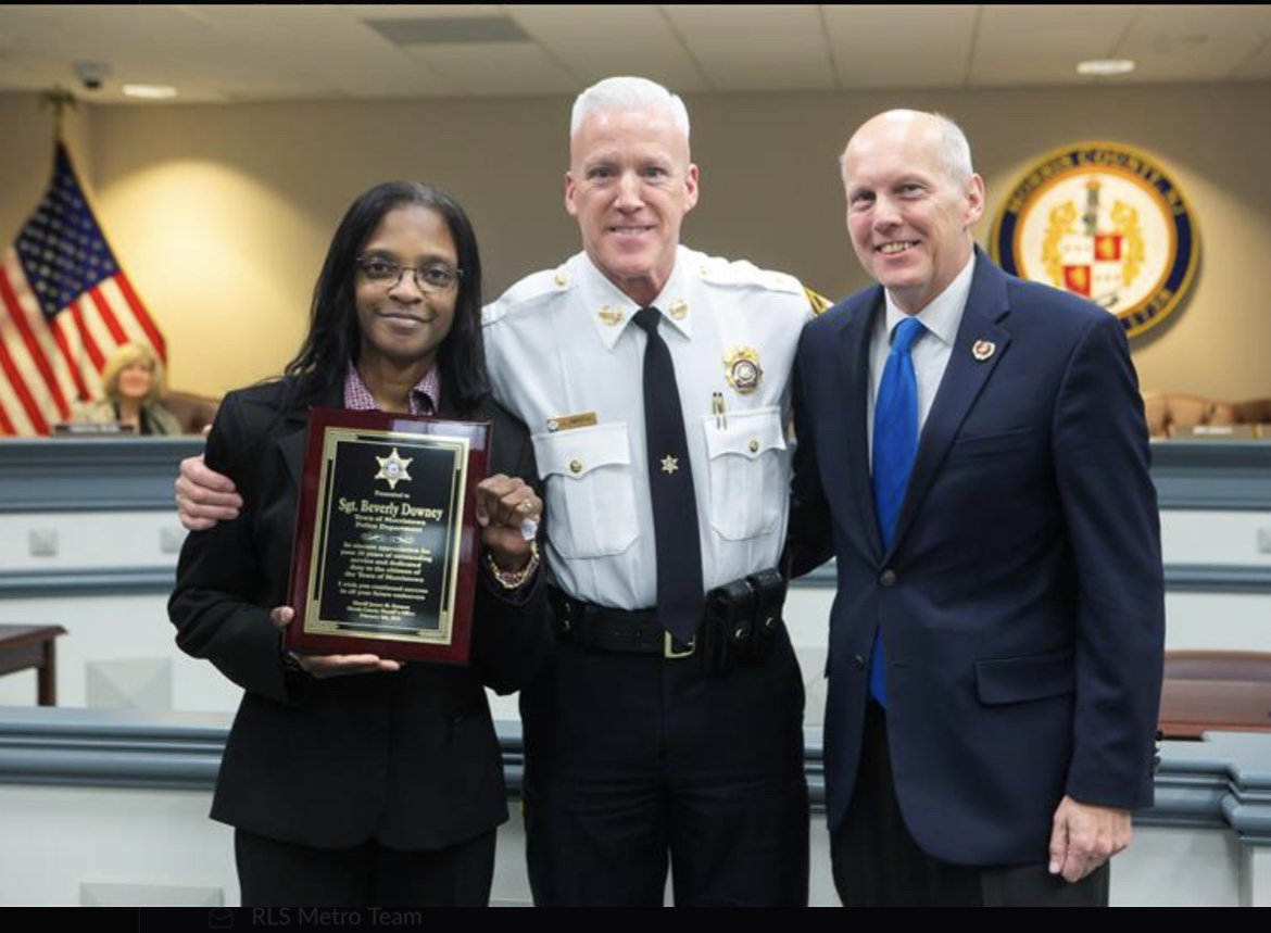 The Morris County Commissioners honored Morristown Patrol Sergeant Beverly Downey at the Commissioners Public Meeting this evening, presenting a special Resolution of Honor to recognize her 26 years of dedicated service with the Morristown Police Department.