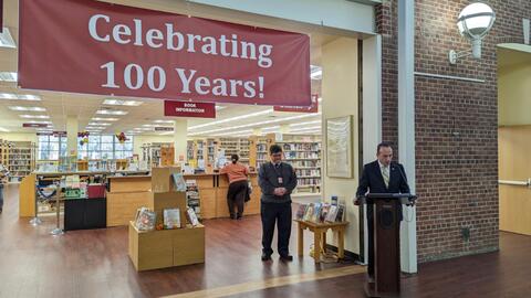 “I’m proud to be here today, inside this treasured institution, praising a century of operations,” said Director Selen, noting that when the COVID-19 pandemic resulted in a statewide shutdown, the library was one of the county operations residents pushed to reopen quickly.