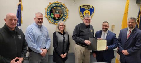 On January 12, Morris County Prosecutor Robert J. Carroll, First Assistant Prosecutor Maggie Calderwood, and Chief of Detectives Chris Kimker issued a commendation to Detective Supervisor Luis Goncalves. Det. Supervisor Goncalves is the recipient of the 2022 New Jersey Special Investigators Association (NJSIA) Investigation of the Year, an award initially presented on October 25, 2022, at the NJSIA Training Seminar and Conference.