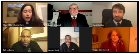 Morris County Prosecutor Robert J. Carroll, First Assistant Prosecutor Maggie Calderwood, and Sgt. Patrick LaGuerre joined the panel, composed of Rev. Alison Miller of Morristown Unitarian Fellowship and the Interfaith Clergy Council; Herman Scott, Chaplain of the Morris County Jail and Criminal Justice Chair of the Morris County NAACP Branch; and Frank McMillan, Chair of New Jersey Together.