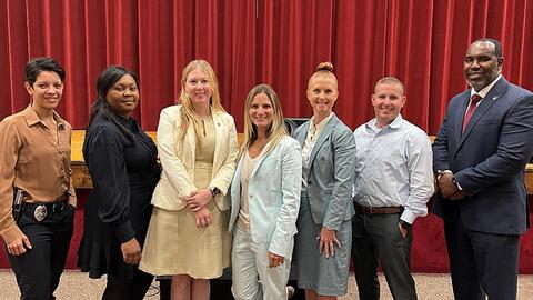 IMAGE: [L-R: Detective Judy Torres, Newton Police Dept.; School Assistant Principal Angela Dunbar; Sally Monkemeier, Sussex County Prosecutor’s Office; Supervising Assistant Prosecutor Samantha DeNegri, Morris County Prosecutors Office; School Principal Samantha Castro; Detective Jared Zapp, Newton Police Dept.; Sgt. Patrick LaGuerre, Morris County Prosecutor’s Office]