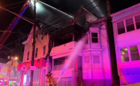 Fire officials called as many as four alarms after flames tore through the roof of one of the building and began to extend to neighboring homes.