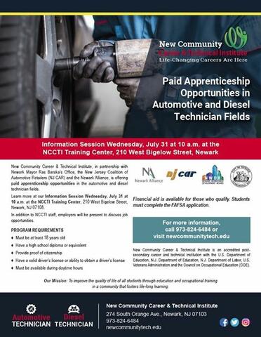 New Community Career & Technical Institute (NCCTI), in partnership with the New Jersey Coalition of Automotive Retailers (NJ CAR), Newark Mayor Ras Baraka’s Office and the Newark Alliance, is offering paid apprenticeship opportunities in the automotive and diesel technician fields.