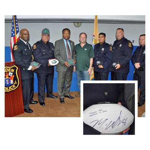 He also presented the Linden mayor and the Police Department with an autographed Jets football signed by defensive lineman and Linden resident, Muhammad Wilkerson. Wilkerson signed the football, “Thanks for Keeping Us Safe”.