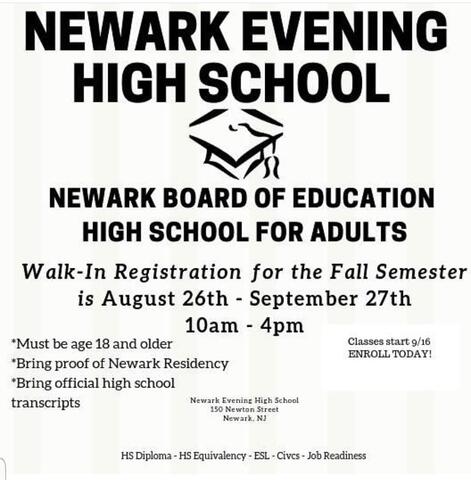 Officials at the Newark Evening High School are announcing that they are now enrolling individuals for the Fall Semester.
